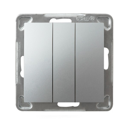 Łącznik zwierny potrójny ŁP-24Y/m/18 - wyposażony w trzy klawisze umożliwiające włączanie i wyłączanie w obrębie trzech obwodów. Używany najczęściej do załączania żyrandoli podzielonych na trzy strefy. Łącznik zwierny jest koloru srebrnego. ŁP-24Y/m/18 wykonany jest z materiału najwyższej jakości, odpornego na zarysowania, przebarwienia i promieniowanie UV, dzięki czemu oferuje trwałość. Posiada stopień ochrony IP20, co wskazuje na przystosowane do montażu wewnątrz budynków.