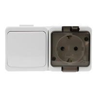Gniazdo pojedyncze 2P+Z bryzgood. SCHUKO z klapką w kol.wyrobu + Łącznik 1-biegunowy IP44, SMART, biały